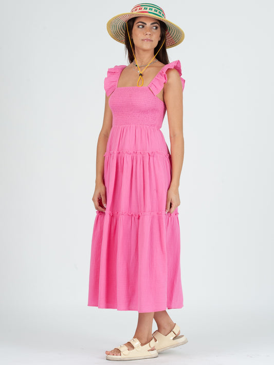 JUDY CRINKLE GAUZE TIERED DRESS-PINK