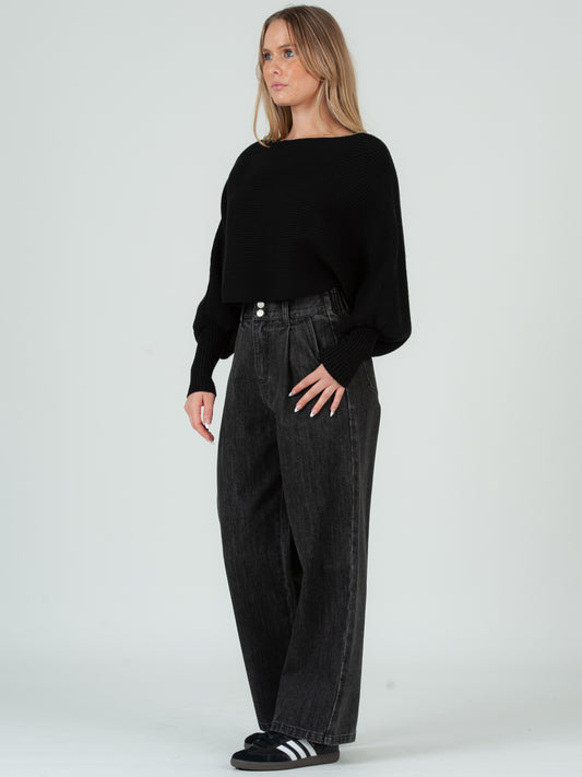 MISHA RIBBED SWEATER TOP-BLACK