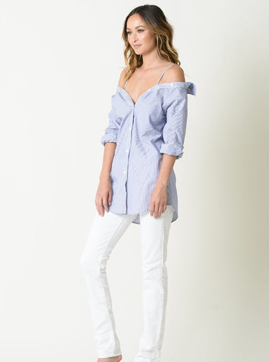 REESE COLD SHOULDER BUTTIN UP SHIRT-BLUE STRIPE