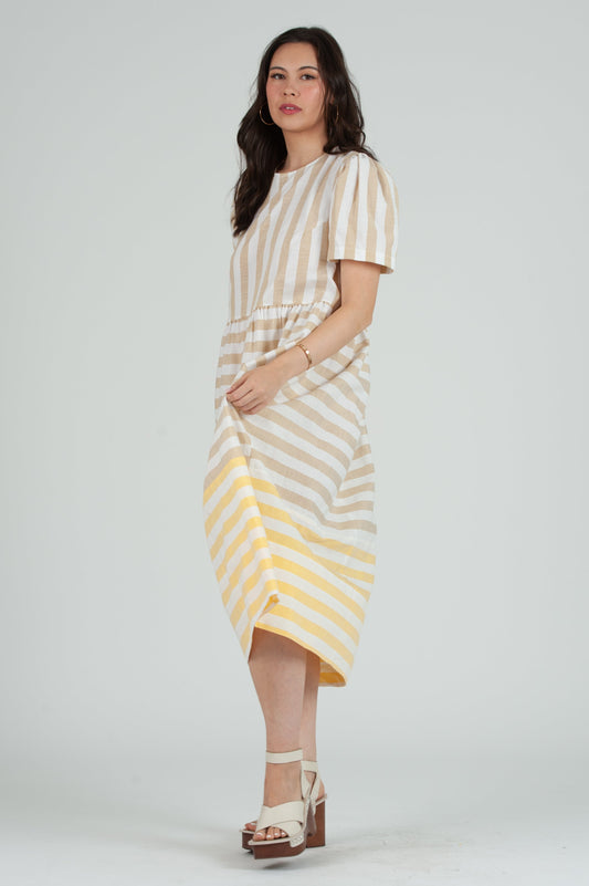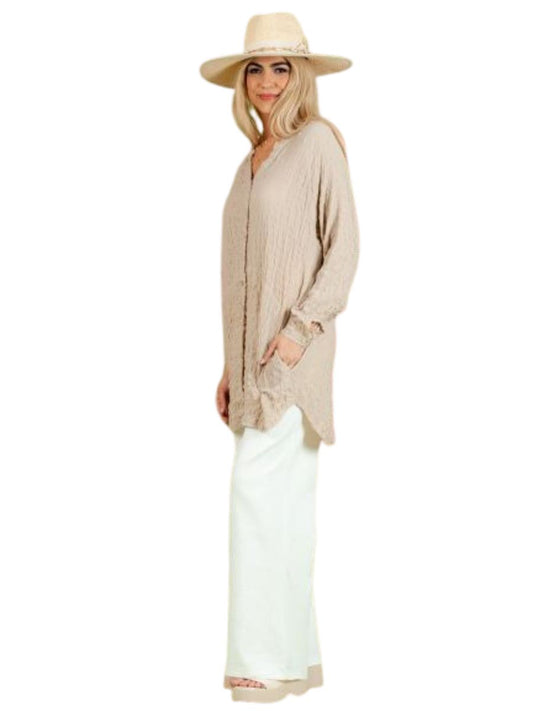 Women's Solid Crinkled Button Down Tunic Top in Beige