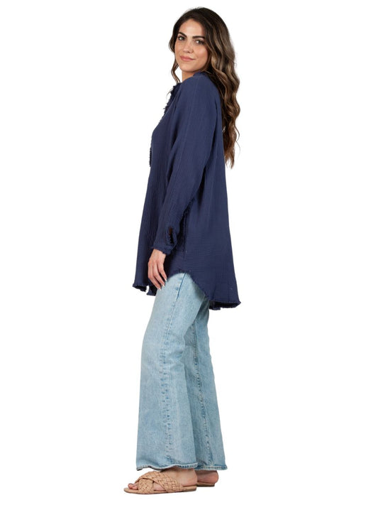 Women's Solid Double Gauze Button Down Tunic Top in Navy
