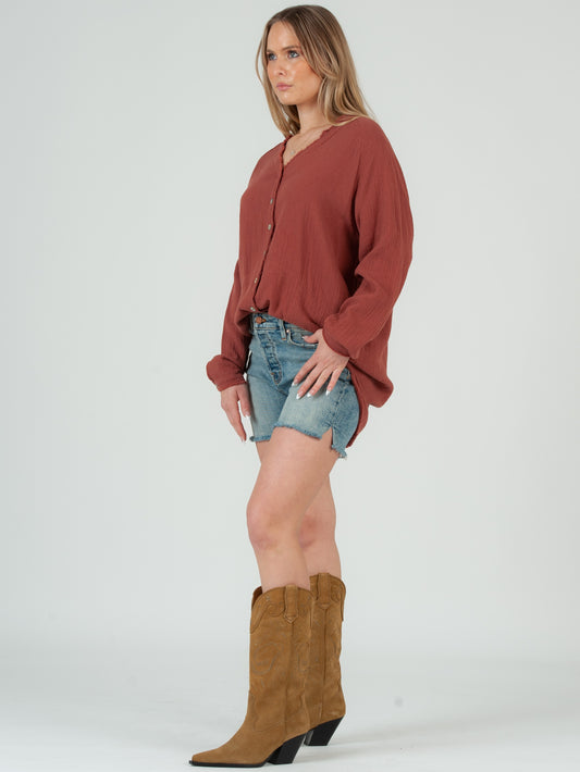 Women's Solid Double Gauze Button Down Tunic Top in Spice