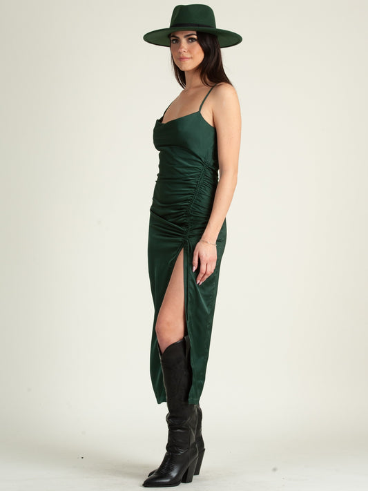 EVIE SATIN RUCHED MIDI DRESS-HUNTER