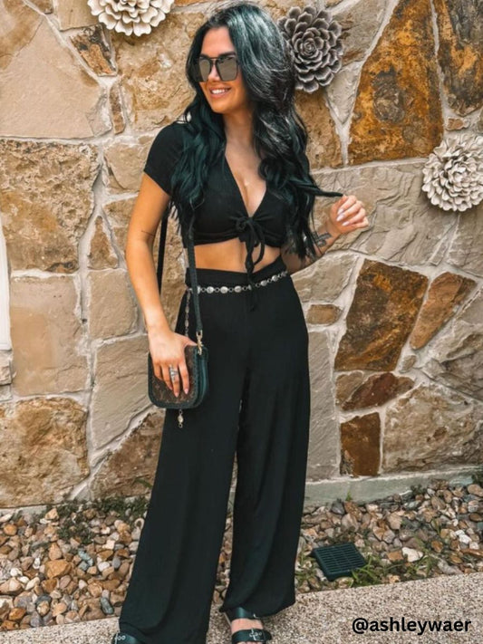 DIANA TIE FRONT CROP TOP+PANT SET-BLACK