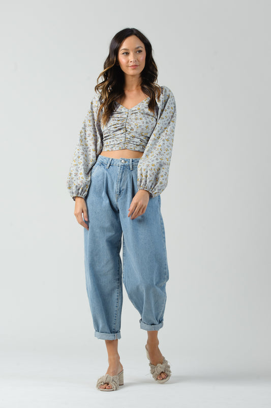 MARINA RUCHED FRONT L/S CROP TOP-BABY BLUE FLORAL