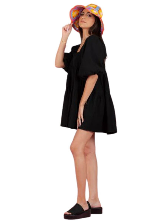 JEAN PUFF SLEEVE BABYDOLL DRESS-BLACK