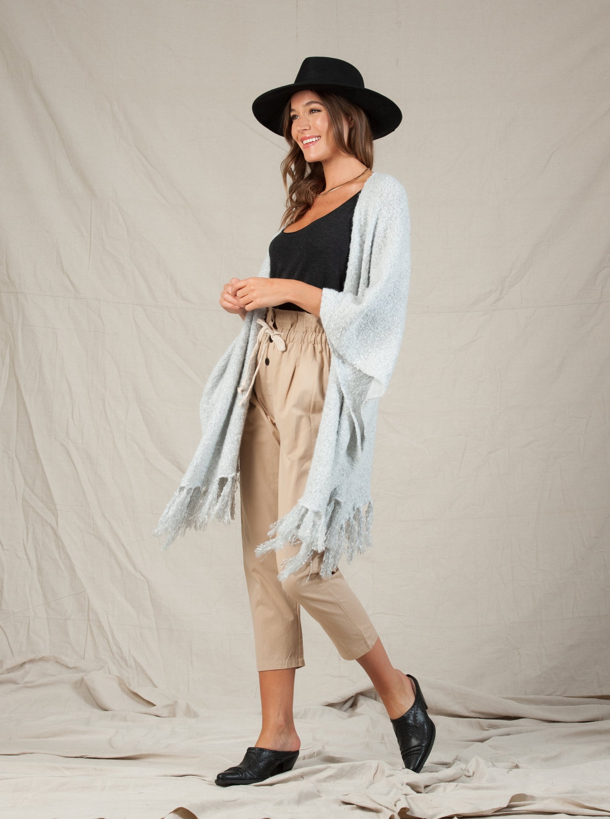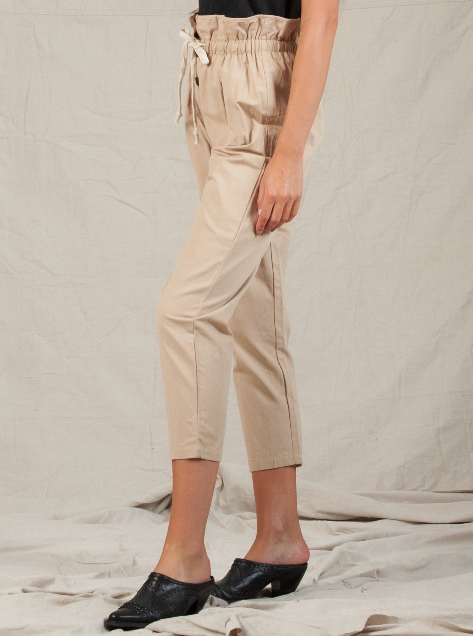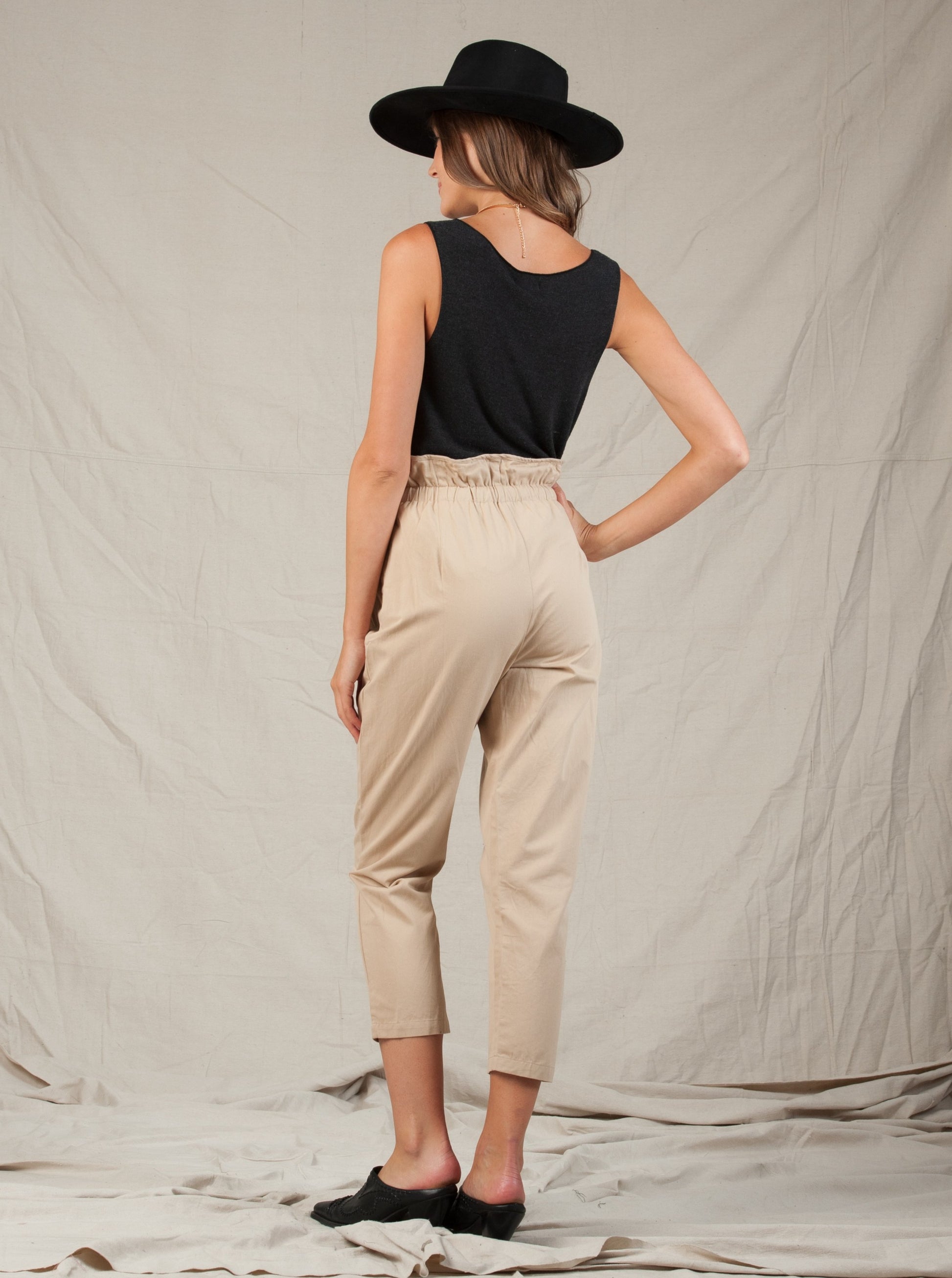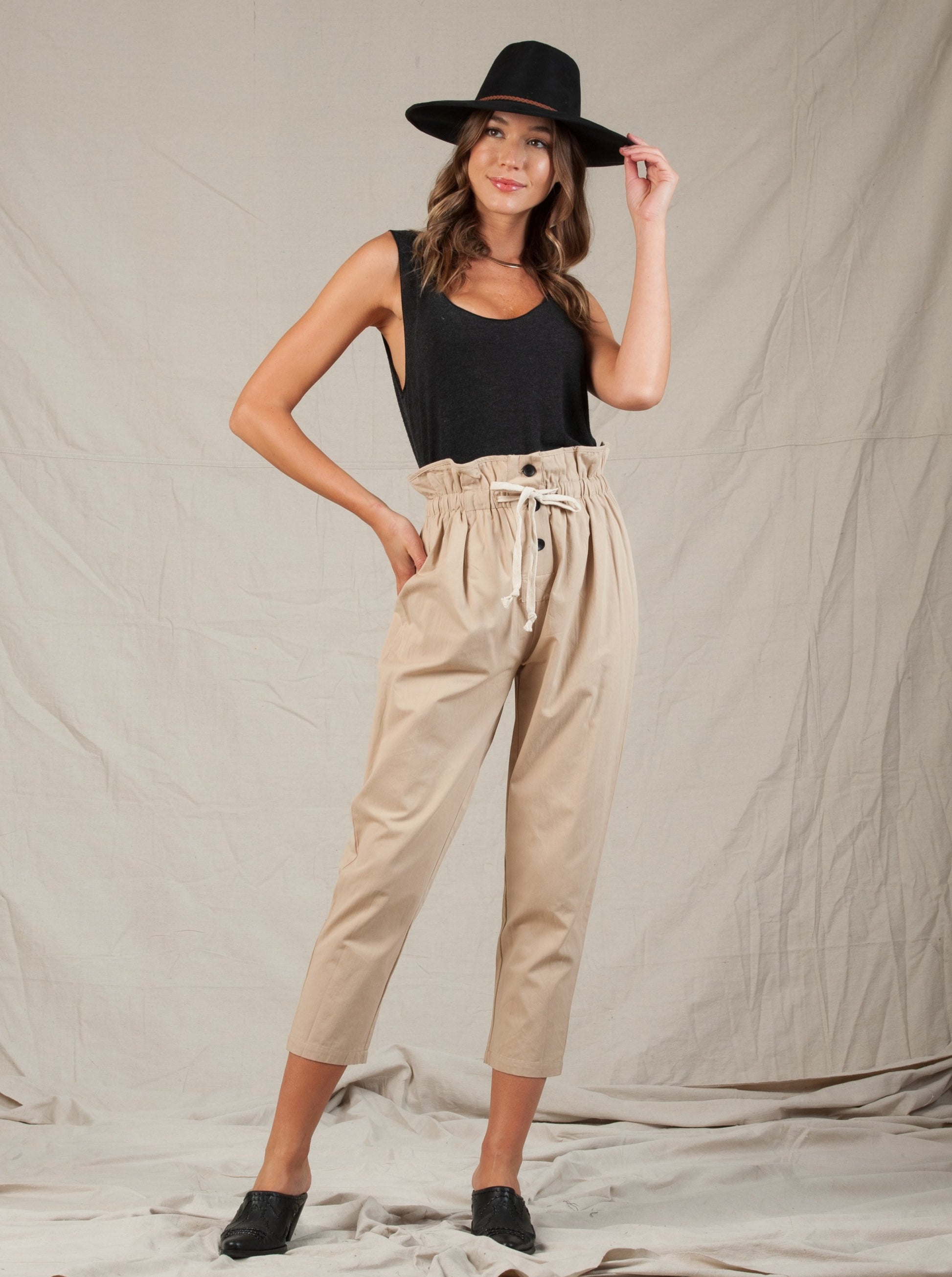 Paper Bag Trousers in Khaki twill, high waisted with button details and self tie belt, flattering on all body types and perfect for any season!