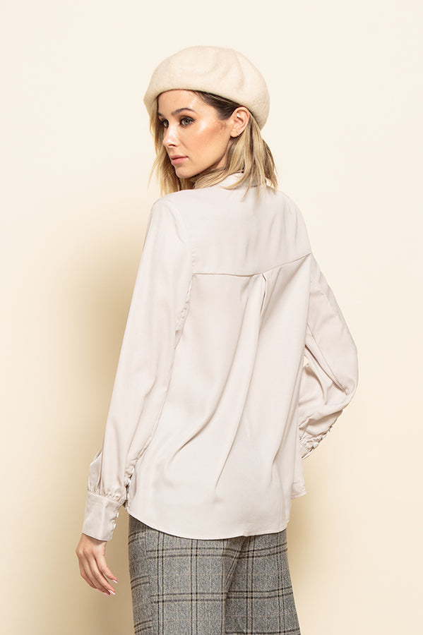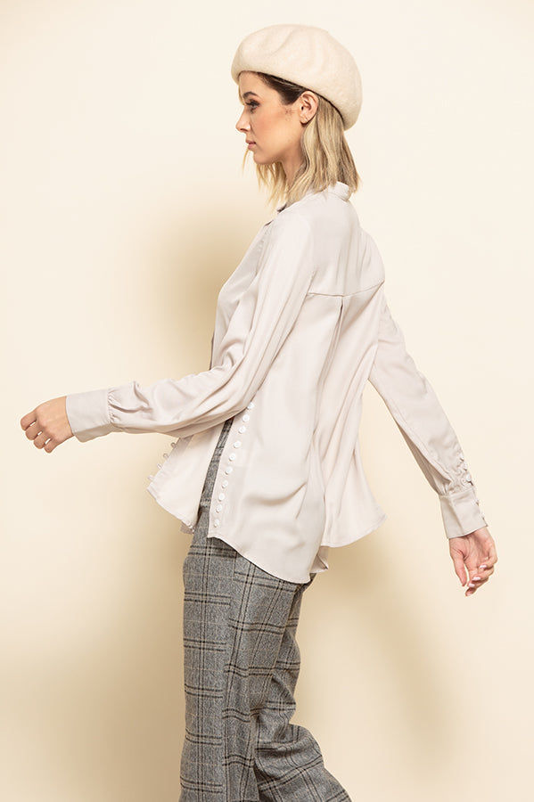 Flowy and feminine pullover blouse with a mandarin collar and side slits closed by a beautiful row of small buttons. The same buttons also line the long cuffs. Wear it open for a sexy twist or buttoned up all the way.