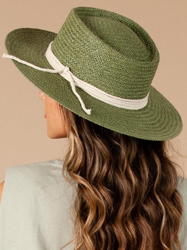 Stiff straw boater hat made in flattering avocado green with rope wrap detail! Get this hat to amp up your fit!