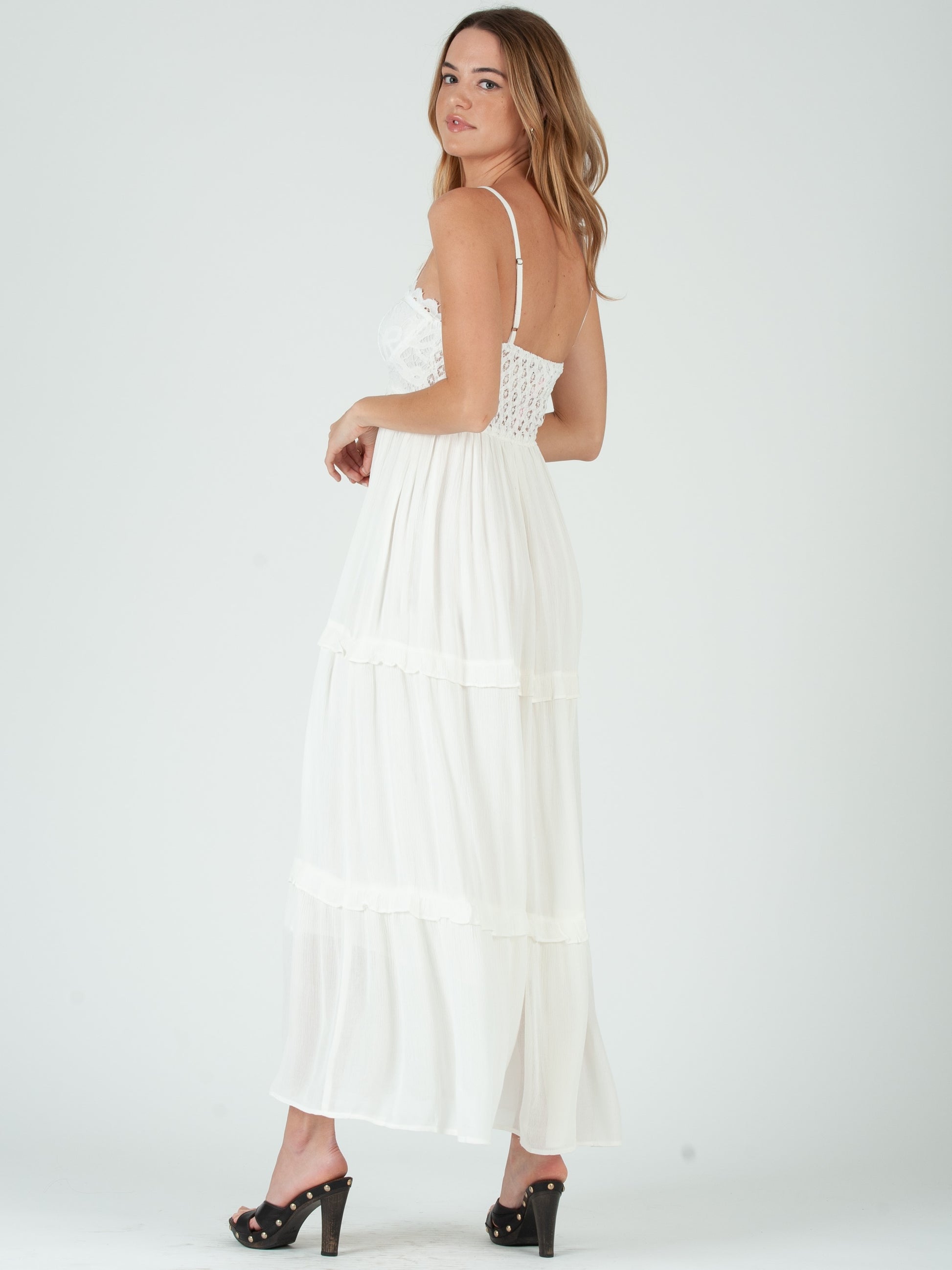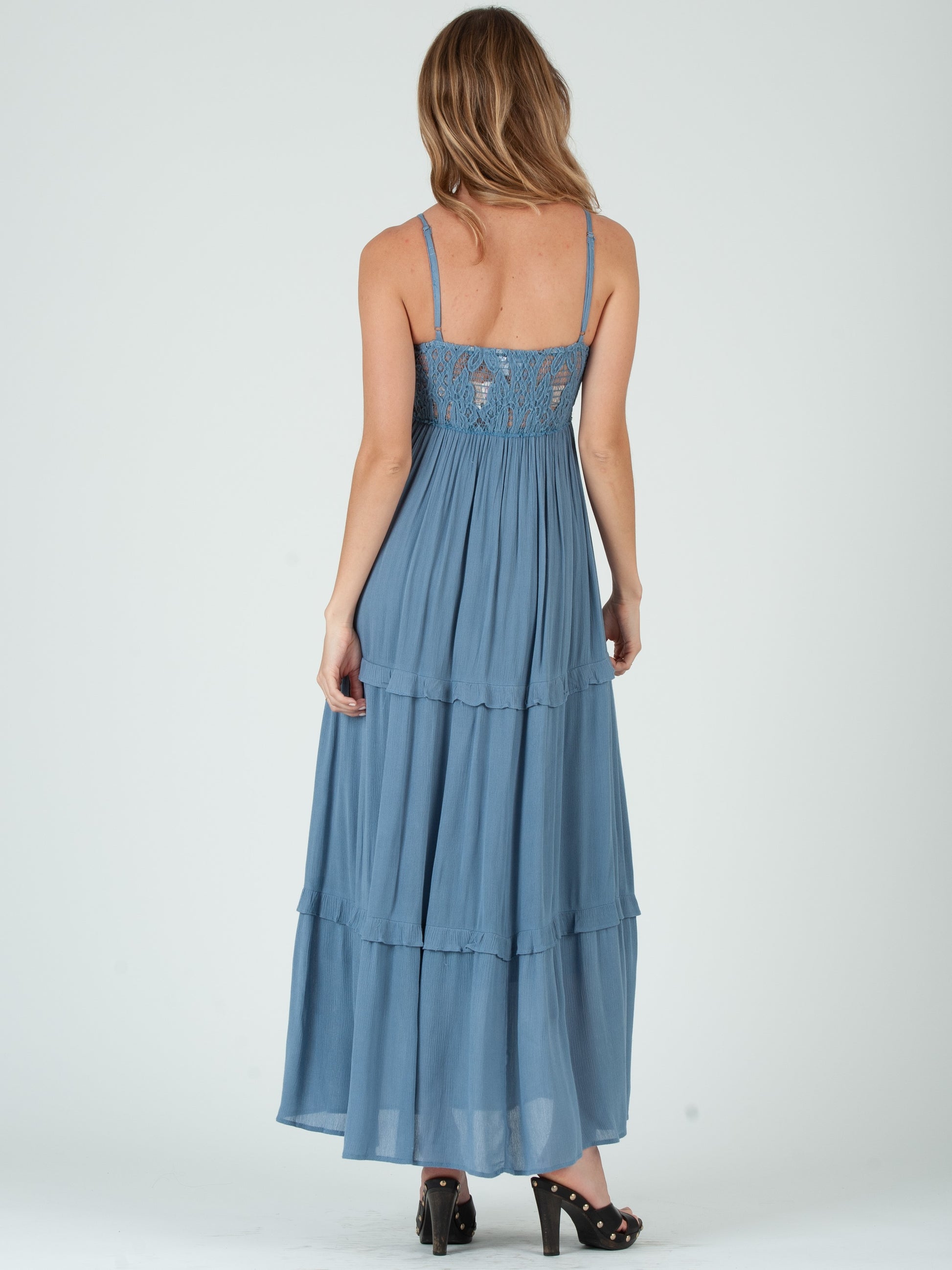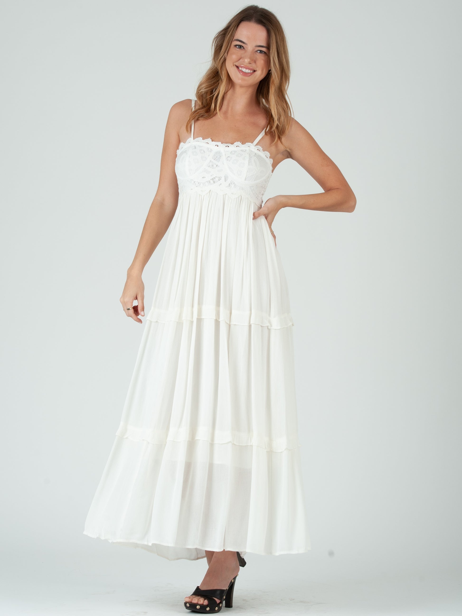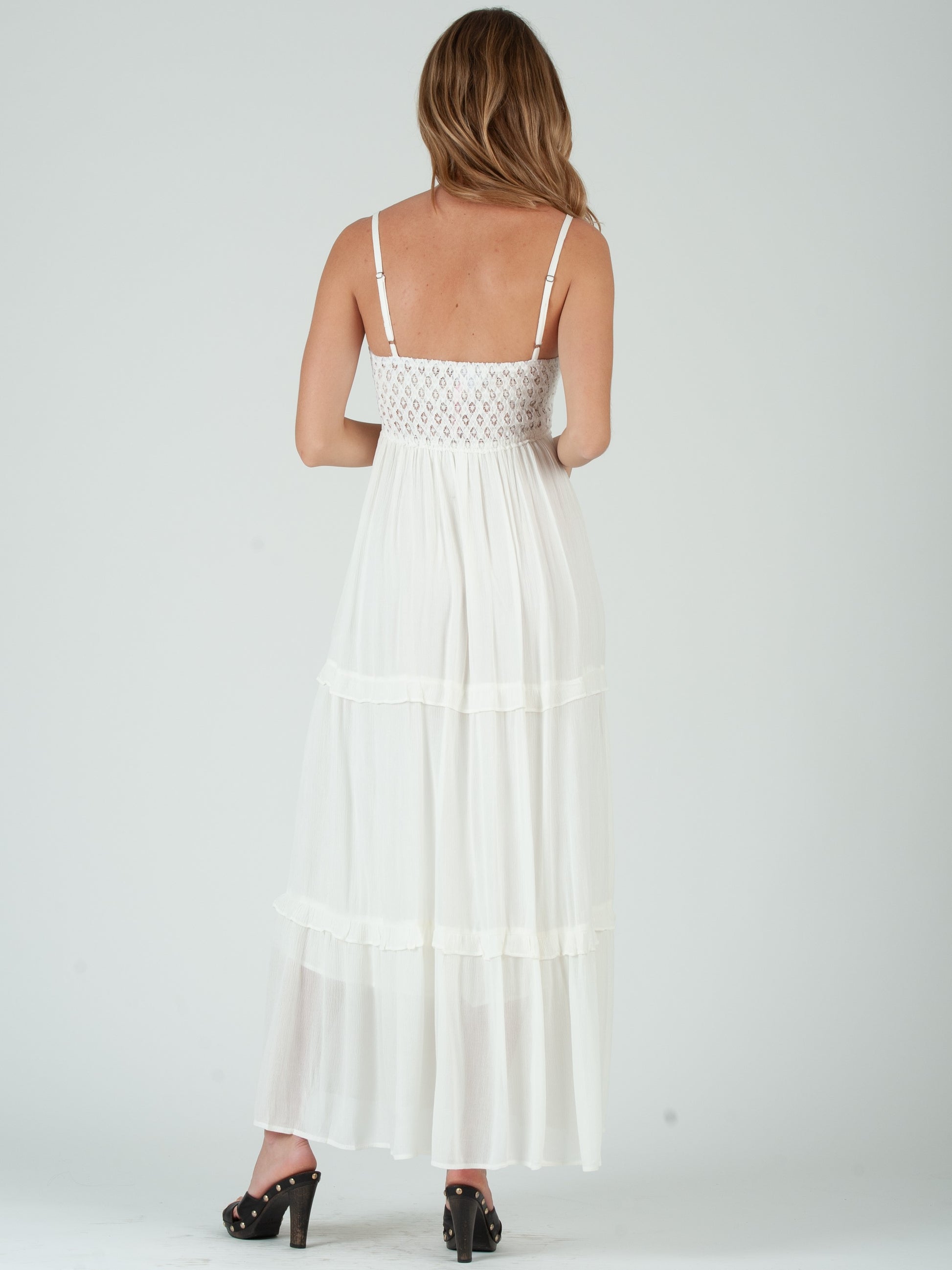 Doily lace detail overlay, smocked back detail fitted and flounce maxi dress. Elegant and boho mix in this maxi dress!