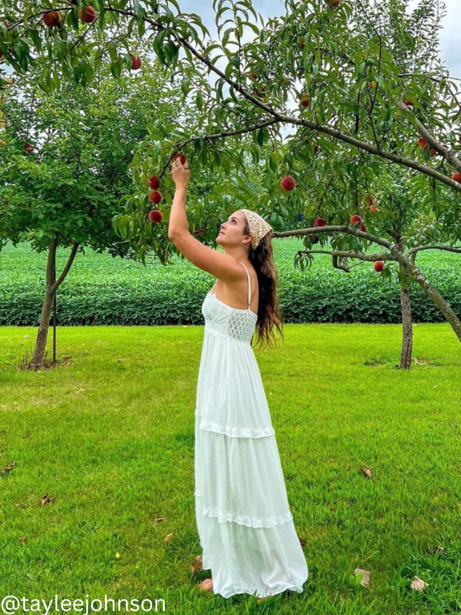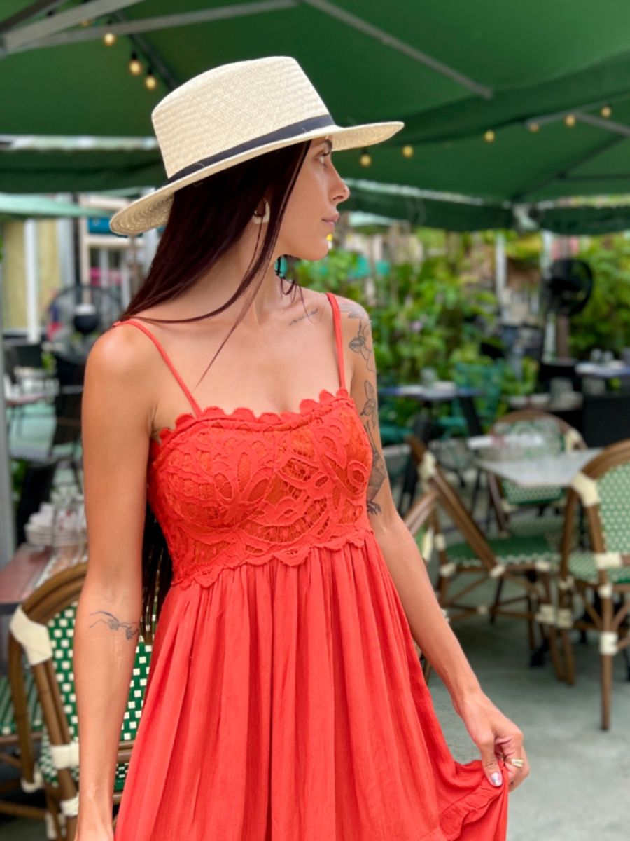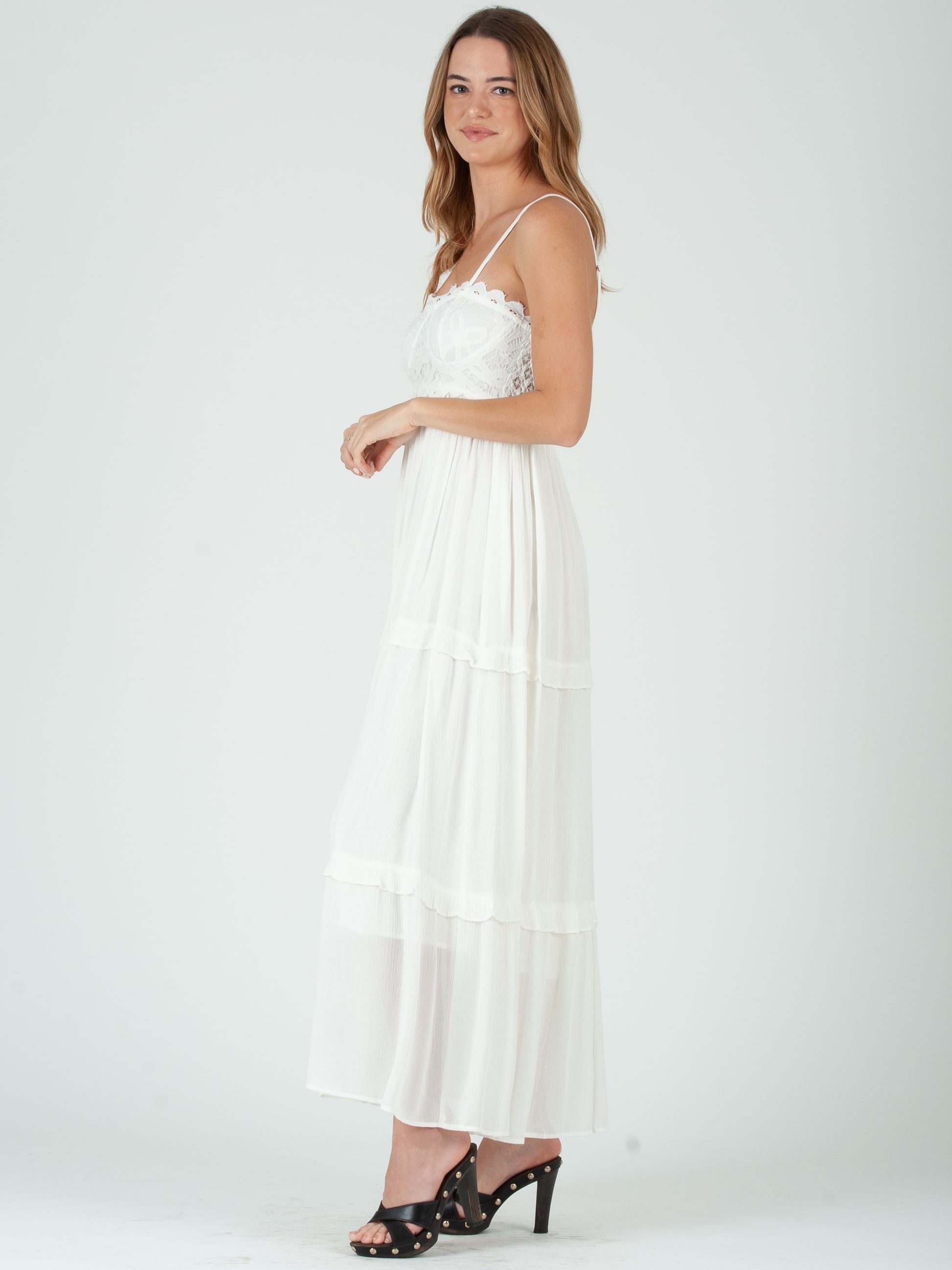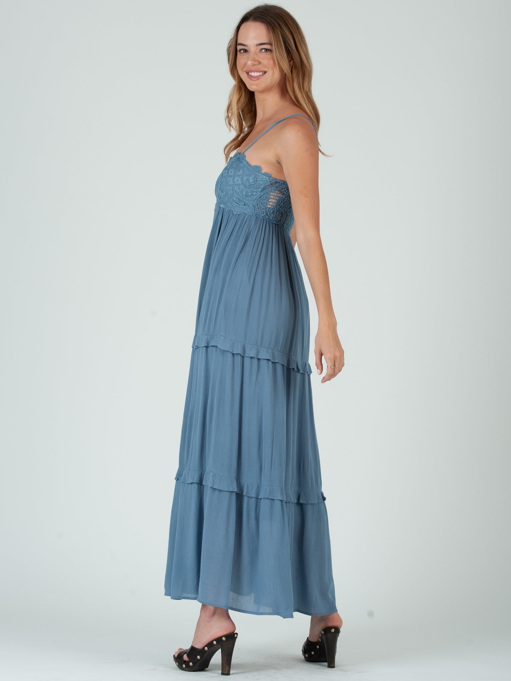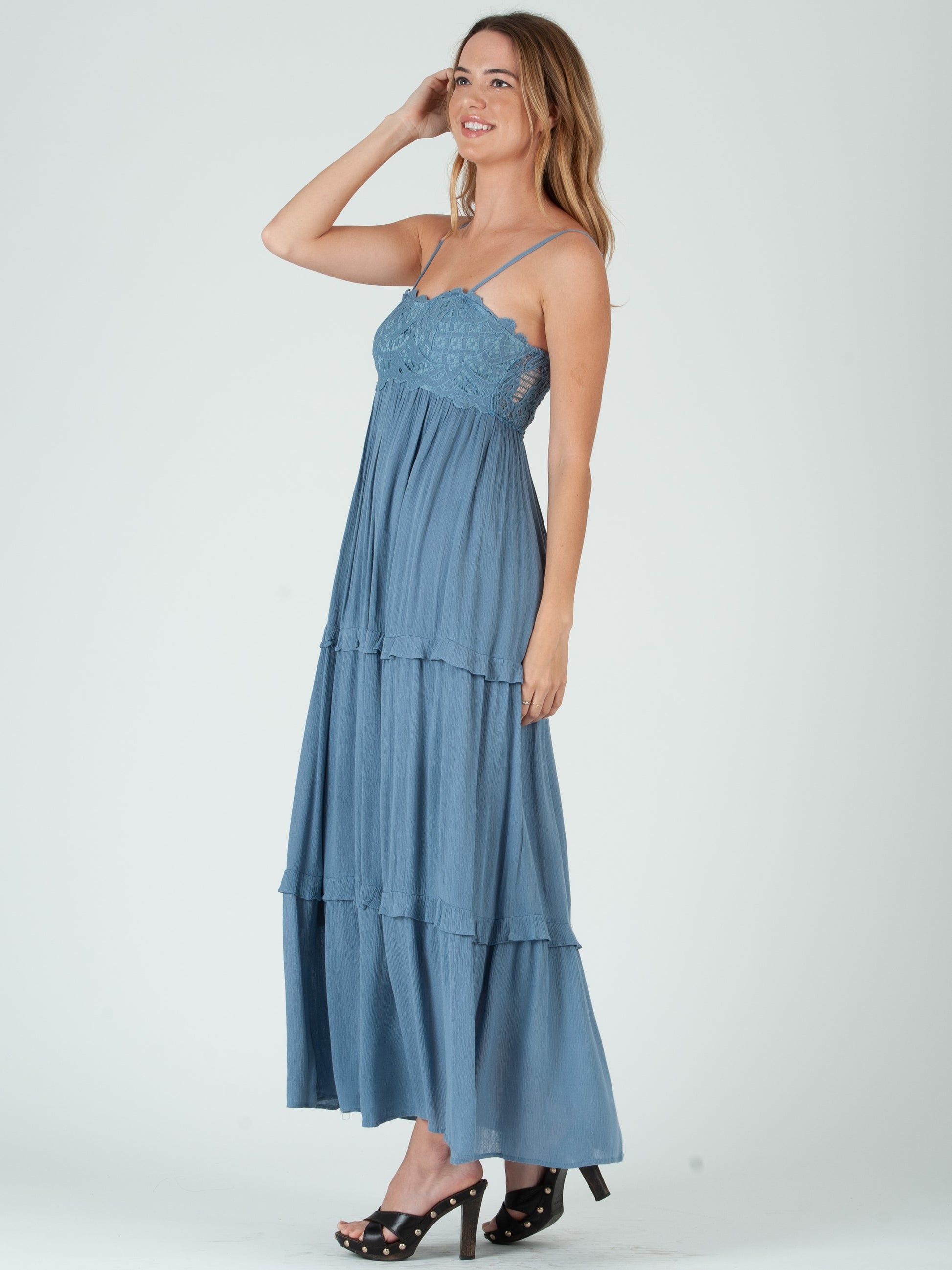 Doily lace detail overlay, smocked back detail fitted and flounce maxi dress. Elegant and boho mix in this maxi dress!
