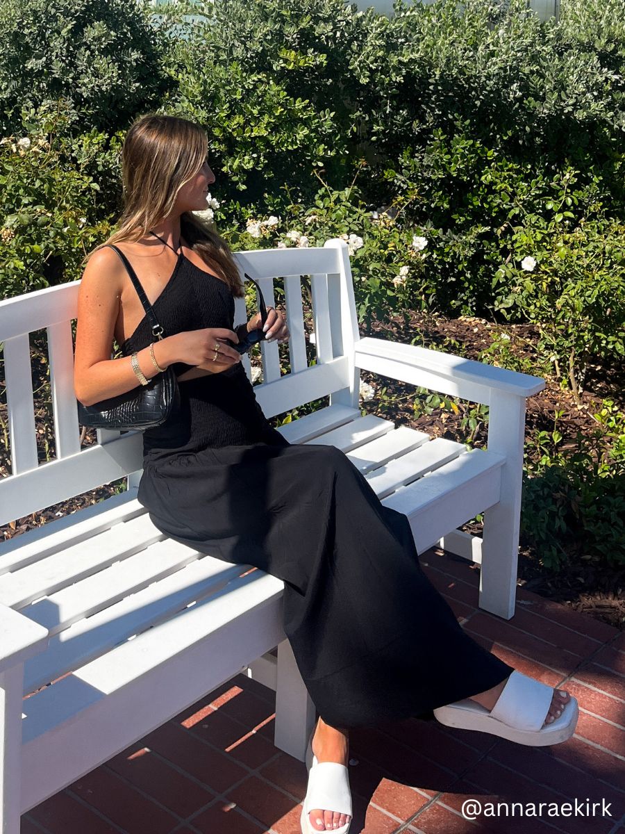 Flowy black halter dress with midriff cutout and waist-smocking detail! Flattering and comfortable dress for all year round looks!