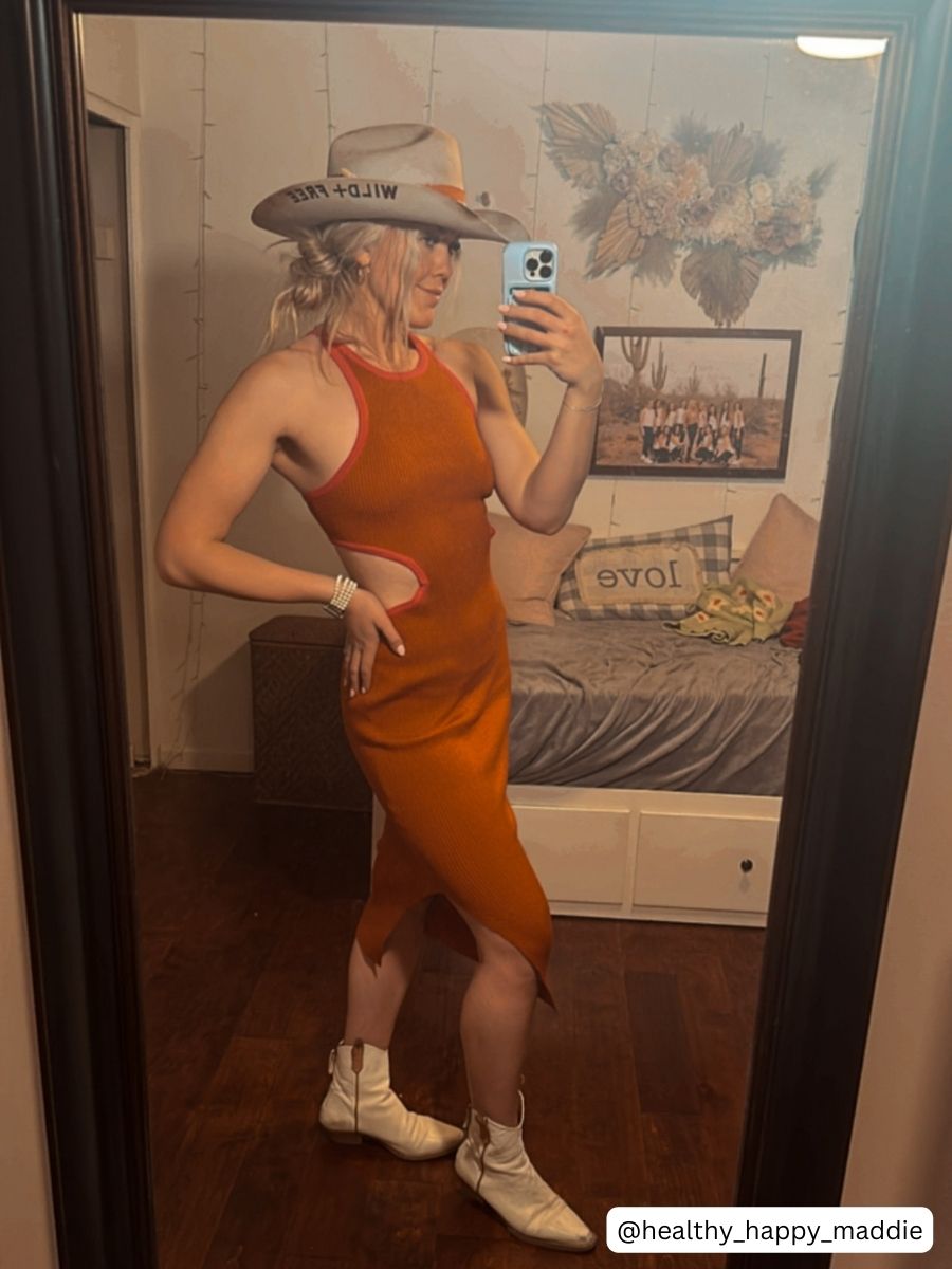 Ribbed sweater knit dress with midriff cutouts and colored binding detail, super flattering, pair with your favorite kicks for a casual look.