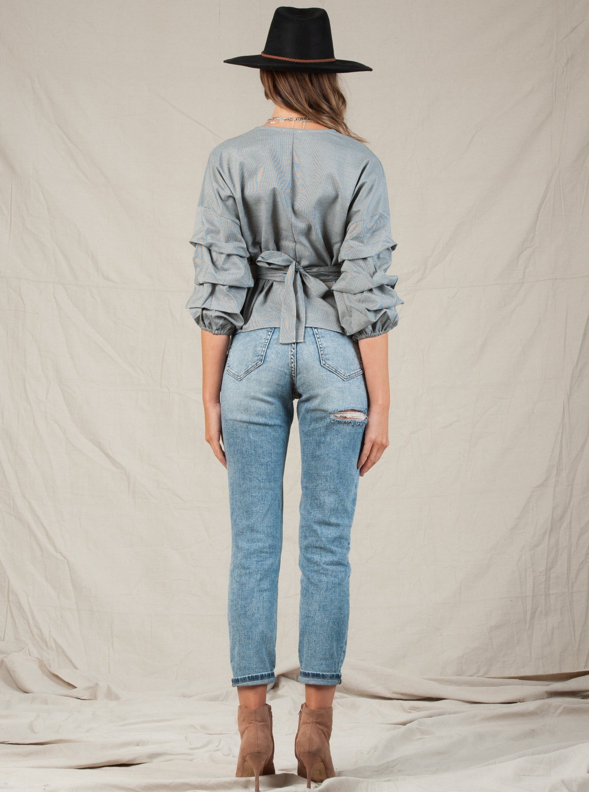 Strikingly structural wrapped top with a defined wrap belted waist + plunging v-neckline. Topped with 3/4 puff sleeves that feature pintuck details.