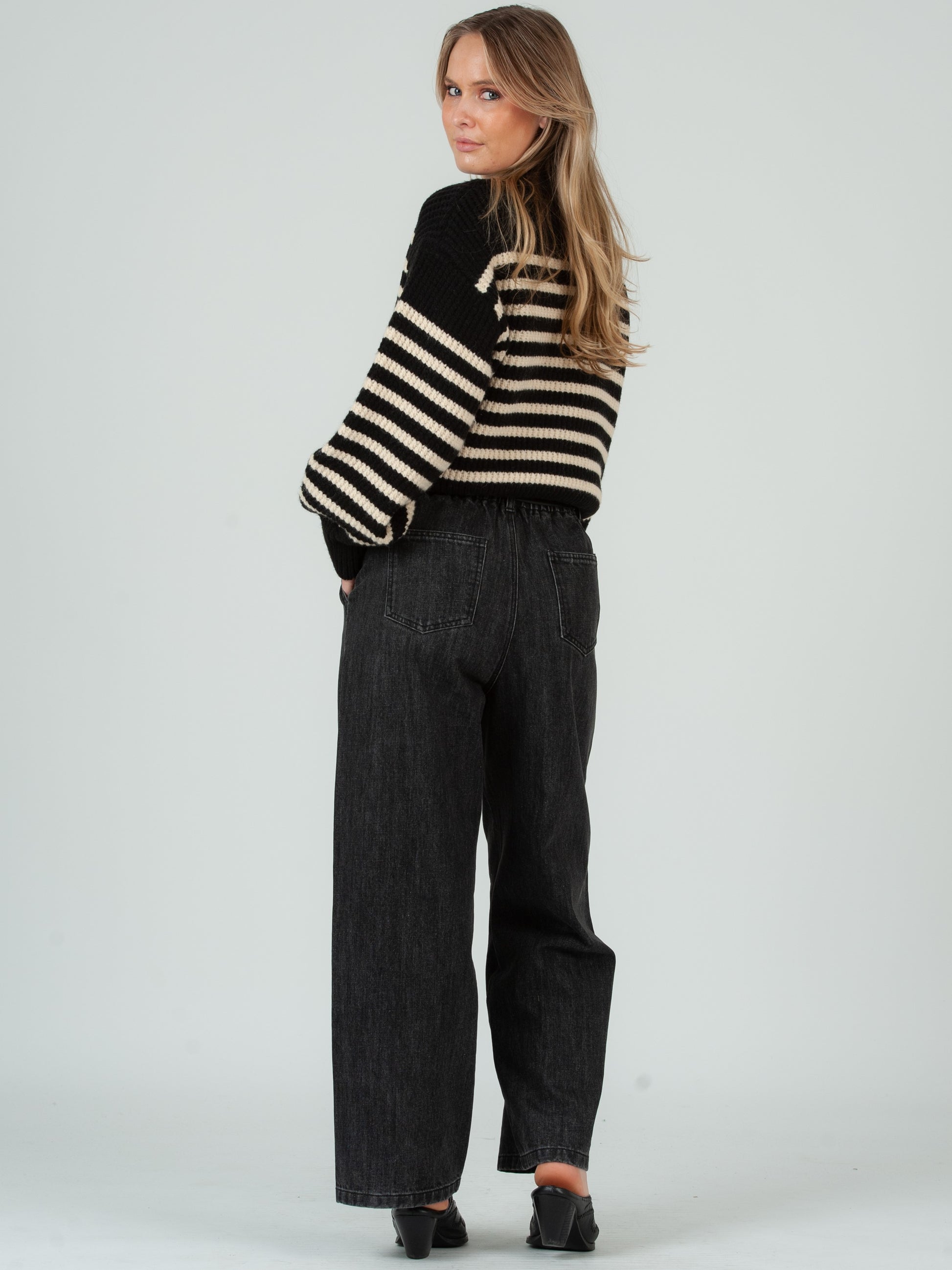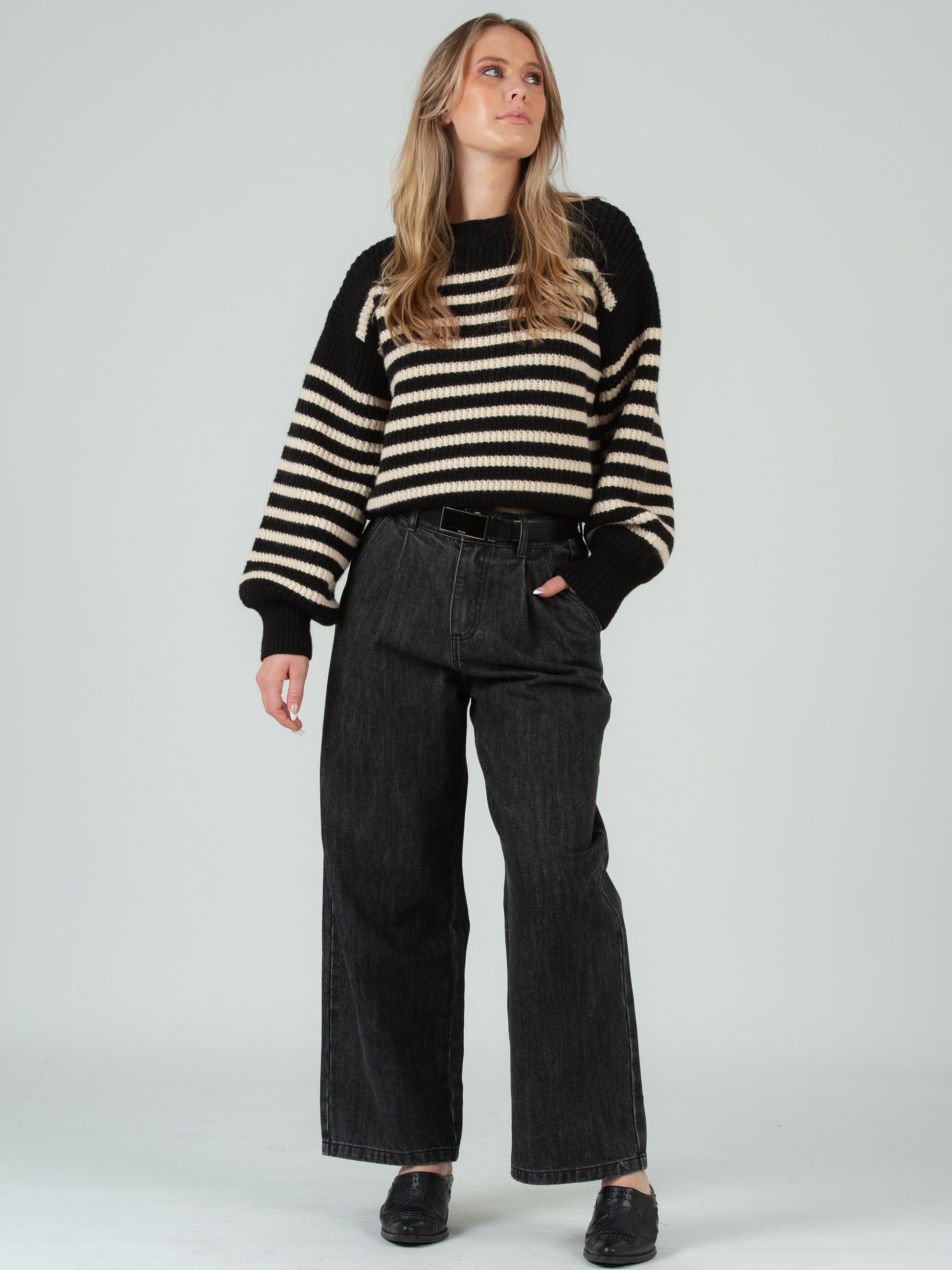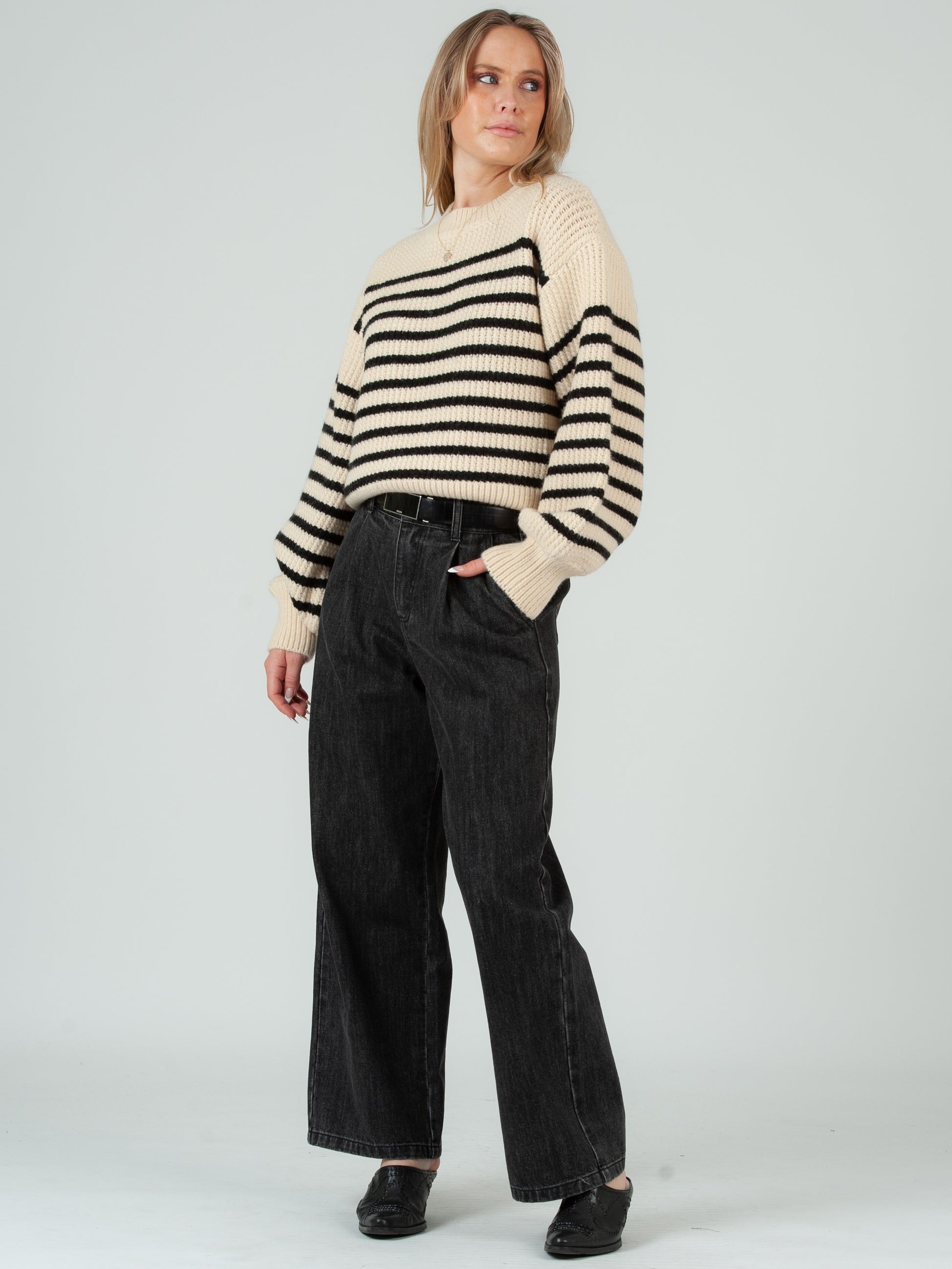 Expertly crafted with soft and supple yarn, this Women's Striped Crew Neck Sweater boasts a chic and intricate knitted design. Stay warm and fashionable with this stylish piece that effortlessly combines comfort and style.